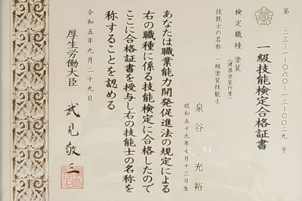 「厚生労働省建築塗装作業 一級技能検定」 を取得